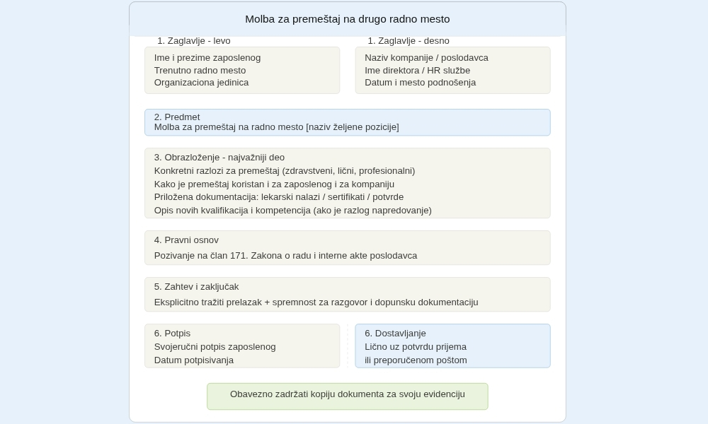 2. Predmet – jasan i precizan, na primer: „Molba za premeštaj na radno mesto [naziv pozicije]“.